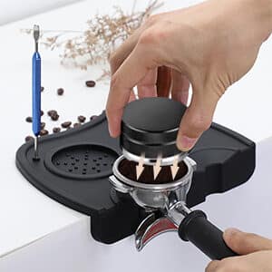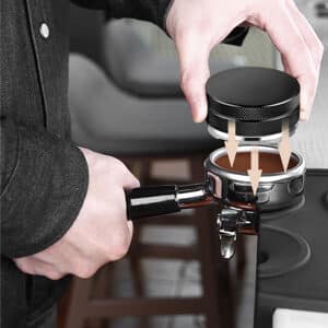 Verwenden Sie die Kaffeeverteiler nach unten in den Siebträger, um das Kaffeepulver zu verdichten